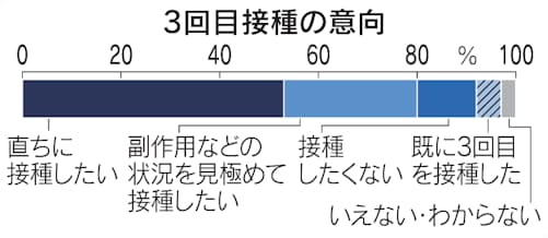 ワクチンの3回目接種についての意向も調べた。「直ちに接種したい」は53%だった。「副作用などの状況を見極めて接種したい」(27%)と「既に3回目を接種した」(5%)を合計した3回目接種に積極的な割合は85%に上った。「接種したくない」は12%にとどまった。